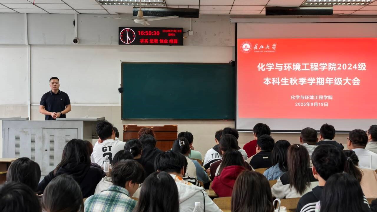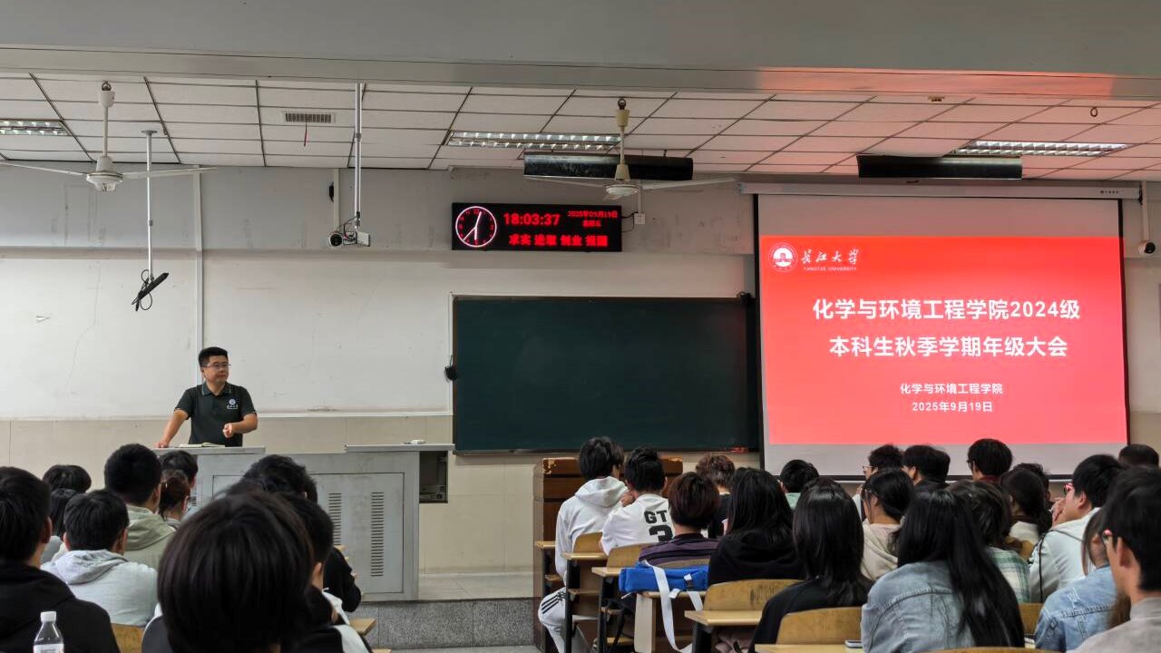 (通讯员 孙 杉 蔡 略)2025年9月19日16时,球王会体育官方网于12教202召开2024级本科生年级大会。本次大会由辅导员蔡略主持,学院党委副书记杨会军、环工系王国保老师、应化系王腾飞老师、储能系张春燕老师及2024级全体本科生共同参会。
