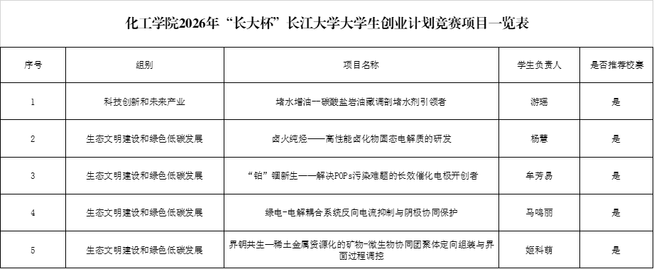按照《关于举办2026年“长大杯”球王会体育官方网大学生创业计划竞赛暨“挑战杯”中国大学生创业计划竞赛校内选拔赛的通知》的要求,经过学生提交申请、学院答辩评审,拟推荐《堵水增油--碳酸盐岩油藏调剖堵水剂引领者》等5个项目申报校级挑战杯,具体名单如下。